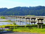 全長897.4メートル、通行幅2.4メートル。静岡の大井川にかかる「世界一の長さを誇る木造歩道橋」としてギネス社にも認定されているのは「蓬莱橋」。