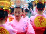 8月15日の18時30分、頭に金銀の灯籠を載せ、ピンクの浴衣を纏った女性たちが狭い境内に現れ、奉納踊りを行います。